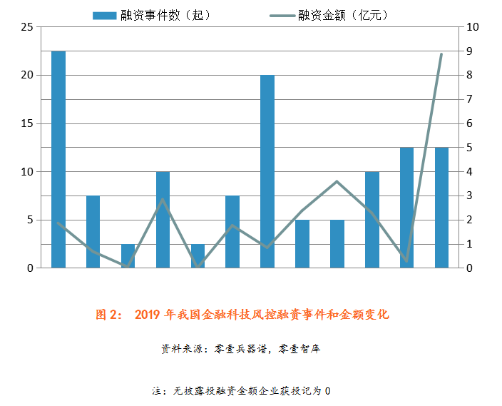 2019年上半年的融資事件數量為21起,下半年為26起,融資事件數量較多的月份分別為1月、7月、10月和12月,其中1月份達到最高峰,融資事件數為9起。在融資金額上,2019年4月同盾科技完成了1億美元的D輪融資,8月玖富數科登陸納斯達克,12月金融壹賬通于紐約證券交易所掛牌上市。
