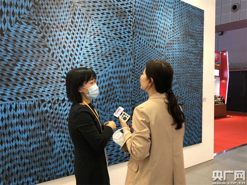 西班牙全球藝術(shù)時(shí)代(Global Artera)公司的合伙人馬科星女士接受總臺央廣記者專訪,并介紹展品(央廣網(wǎng)發(fā) 受訪者供圖)