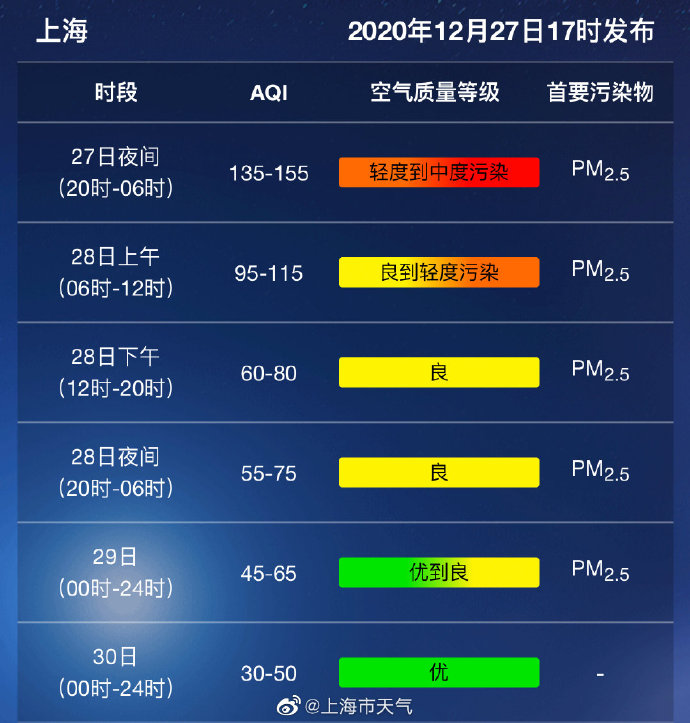 今夜明晨,上?諝赓|(zhì)量欠佳,為輕度到中度污染量級。明天早晨前后大部地區(qū)有霧,上午以前有輕度霾。