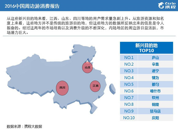 據攜程相關負責人介紹,從熱門目的地的分布可以看出,長三角、珠三角以及京津冀地區(qū)的人最愛周邊游。“鑒于周邊游的距離屬性,出發(fā)地一般不會距離目的地太遠,通常會是車程4個小時或者高鐵2個小時以內。”新興目的地,如江西、山東、四川等地的用戶需求量急劇上升。經過這兩年的市場培育以及消費升級的不斷深化,內陸地區(qū)的周邊游日益活躍,市場潛力巨大。