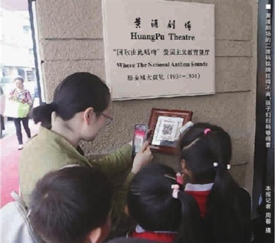 “劇場里紀念活動結(jié)束,孩子們一出來,掃掃墻上的二維碼,就能知道黃浦劇場的光輝歷史!蹦暇〇|路街道工作人員林潔說,二維碼銘牌掛得不高,孩子們掃碼夠得著。