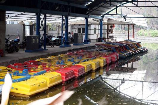 公園水位偏低,淤泥沉積,游船沒(méi)有開放。
