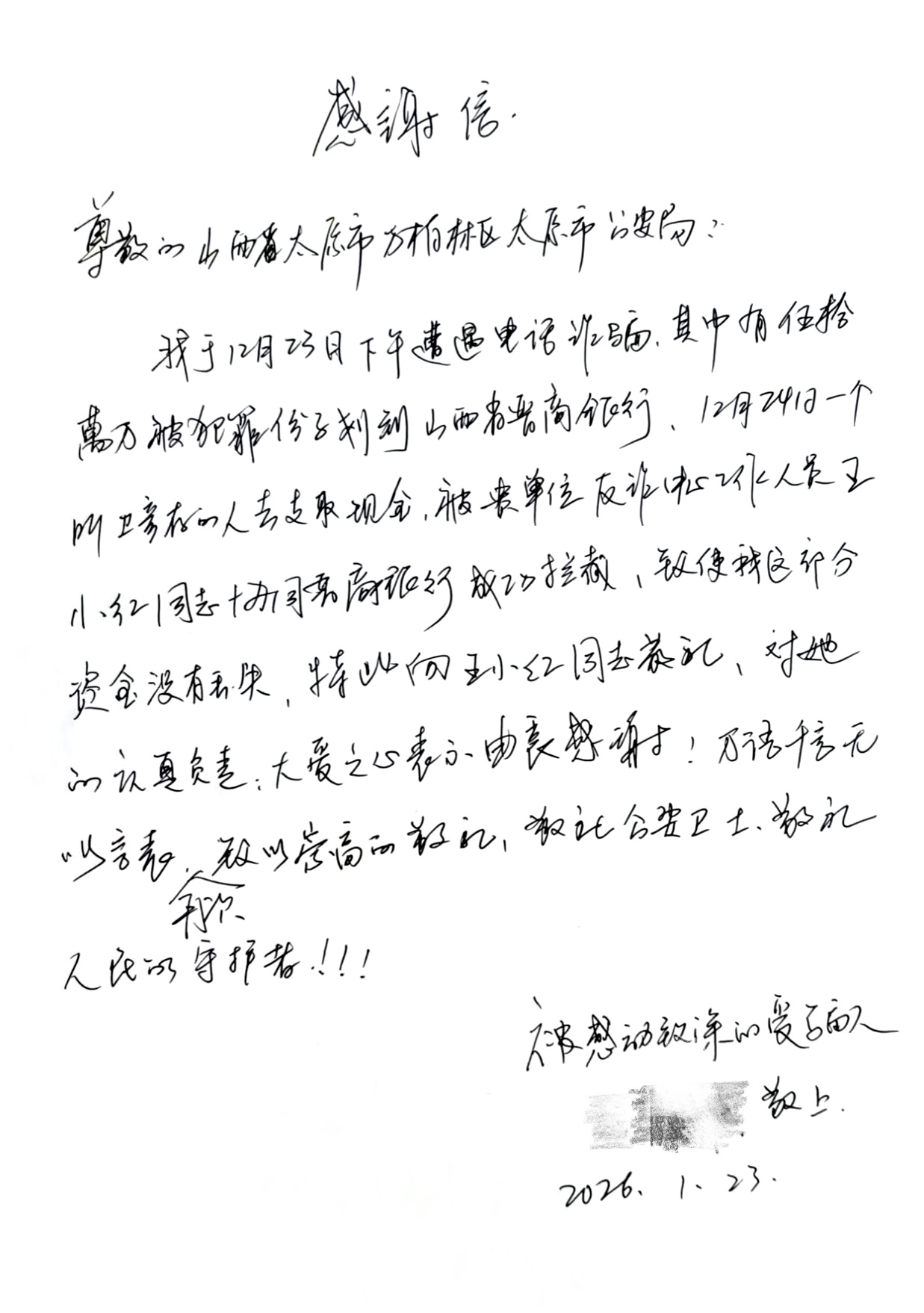 一紙手書傳暖意,一句致謝顯擔(dān)當(dāng)。近日,晉商銀行派駐太原市反詐中心員工王小紅,因成功攔截一筆50萬元涉詐資金,收到了受害人王女士親筆書寫的感謝信,字里行間滿是誠摯謝意,“人民的守護(hù)者”六個(gè)字,更是道出了民眾對(duì)金融反詐工作者的認(rèn)可與敬意。