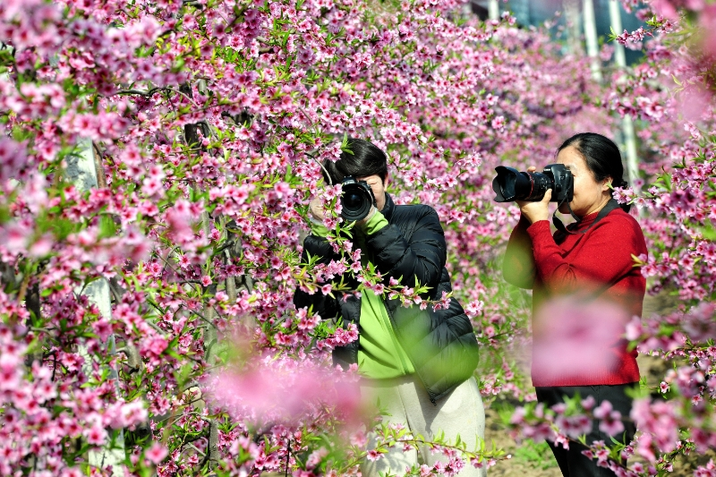 2月11日,立春過(guò)后,寒意未消。山西省運(yùn)城市萬(wàn)榮縣通化鎮(zhèn)西孝原村的設(shè)施油蟠桃大棚內(nèi)已是暖意融融、桃花盛放。粉白花瓣綴滿(mǎn)枝頭,暗香浮動(dòng),勾勒出一幅冬日里的動(dòng)人春色,吸引眾多攝影愛(ài)好者前來(lái)采風(fēng)創(chuàng)作。