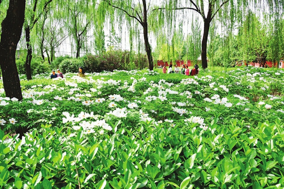 4月19日,文水縣武則天紀念館內(nèi)的40畝牡丹花恣意盛放,吸引不少游人游園賞花、拍照打卡。(馮增清 攝)