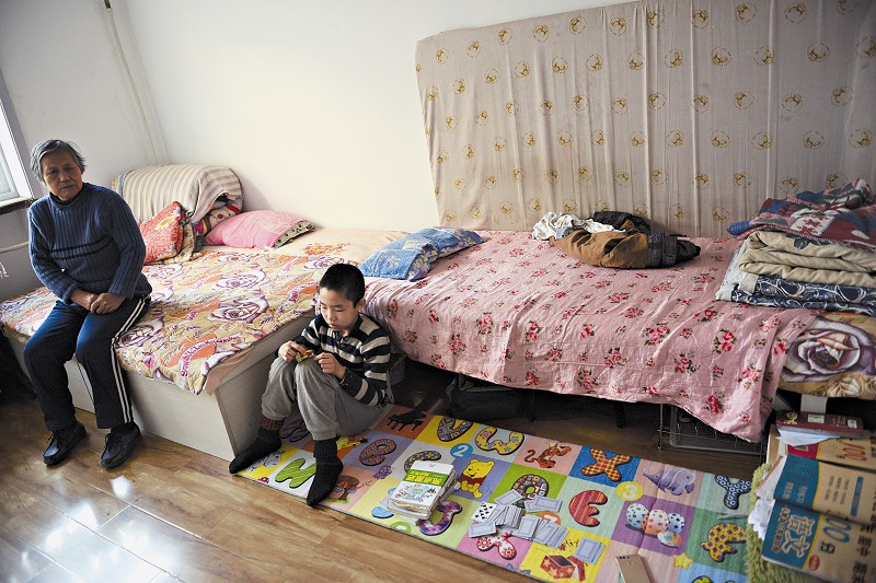 客廳角落里,小浩博正在做的是三年級的語文練習(xí)題,字跡很工整。小浩博有點(diǎn)內(nèi)向,但當(dāng)記者問起想不想讀書時,他說:“我就想上學(xué)”。當(dāng)聊到他的父母親時,小浩博低下了頭。問他有沒有朋友,他露出了笑容:“我有好幾個好朋友,都是我們院子里的,經(jīng)常一起玩過家家……”“剛開始還能輔導(dǎo)他一些簡單的題,到后來學(xué)東西,都是靠他叔叔家的女兒——比他小3個月的妹妹,周末時來輔導(dǎo)一下,大多靠自學(xué)。”老人神色黯然,“別看這娃不愛說話,平時還挺調(diào)皮,有幾次和小朋友打鬧,還被人家家長找上門。還有一次,孩子出去玩到天黑都不回家,可把我給急壞了!弊阅侵螅棠膛滤鋈ト鞘,自己出門時就把他鎖在家里,她認(rèn)為這樣比較安全。