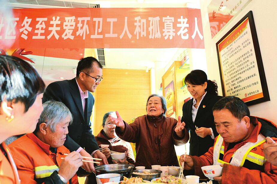 12月15日,80歲的孤寡老人閆金鳳在愛心餐桌上情不自禁地說:“太感謝你們啦,社區(qū)的黨員干部和親人一樣!碑斎,在冬至到來前夕,太原市迎澤區(qū)雙西二社區(qū)組織黨員志愿者包愛心餃子,邀請在寒冬堅守崗位的環(huán)衛(wèi)工人、社區(qū)孤寡老人同吃愛心節(jié)日餐,讓大家感受到社區(qū)大家庭的關(guān)愛。(記者李兆民 攝)