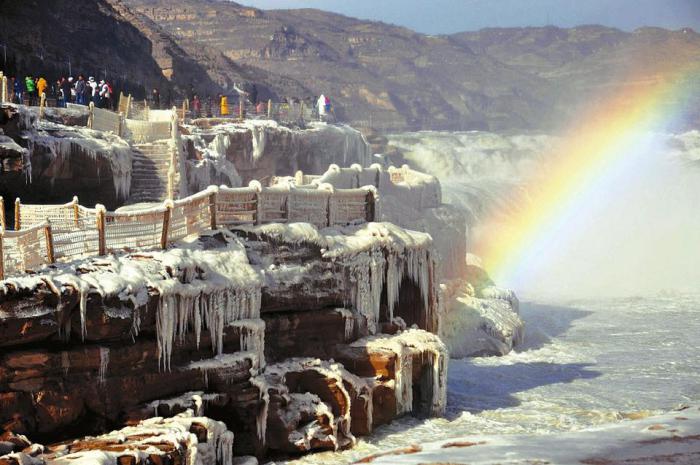 12月11日,吉縣黃河壺口瀑布出現(xiàn)“冰瀑玉壺”景觀。近日,受持續(xù)降溫天氣影響,吉縣黃河壺口瀑布出現(xiàn)“冰瀑玉壺”景觀,瀑布下游的十里龍槽已完全被流凌覆蓋,凝結(jié)成潔白的“玉帶”,吸引了眾多游客和攝影愛好者前來感受冬日里的別樣景觀。