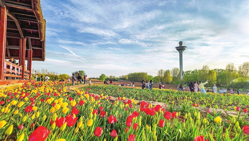4月13日,長治市漳澤湖國家城市濕地公園內(nèi)郁金香競相綻放,紅黃相間的郁金香沿坡地鋪展成絢爛花海,游客漫步花間、駐足打卡,盡享春日郊野的閑適與生機。(牛子儒 攝)