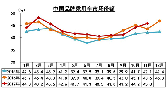 11月,自主品牌乘用車共銷售118.6萬輛,同比增長5%,市場份額提升2.2個百分點,達(dá)到45.8%。其中,轎車銷售26.3萬輛,同比增長0.1%,占據(jù)21.5%的市場份額;SUV銷售70.5萬輛,同比增長16.5%,市場份額達(dá)到63.5%,提高了4.2個百分點;MPV銷售17.7萬輛,同比下滑15.5%,市場份額為81.8%,下降7.3個百分點。陳士華表示,本月自主品牌表現(xiàn)良好,其中SUV是拉動其增長的主要動力。另外,自主品牌轎車的市場份額本月也有所增長。