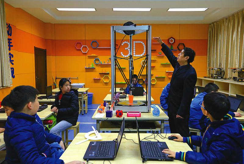1月6日,西安交通大學附屬小學3D打印課上,趙文安老師正在為學生講解三角洲3D打印機運行原理。3D打印進入小學課堂,讓學生在課堂上高效完成創(chuàng)意構(gòu)思、三維建模設(shè)計和成品打印的過程。