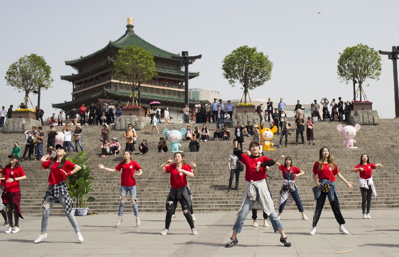 原來(lái),今天是“五四”青年節(jié),共青團(tuán)陜西省委聯(lián)合西安音樂(lè)學(xué)院團(tuán)委,在西安市鐘樓金花廣場(chǎng)為全省廣大青年們送出了一份特別的禮物—— “快閃”秀,以這種青年人的方式慶!拔逅摹鼻嗄旯(jié)。