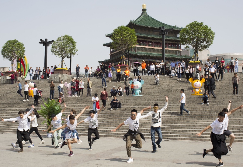 團(tuán)員青年們5月4日下午在鐘鼓樓下沉廣場(chǎng)以“快閃”的方式慶祝五四青年節(jié)。西安晚報(bào)首席記者王健 攝