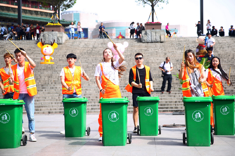 西安新聞網(wǎng)訊(文記者張松)鐘樓金花廣場(chǎng)今日行人如織。突然,十個(gè)綠色的垃圾桶被搬進(jìn)了廣場(chǎng)。圍觀的群眾正在納悶把垃圾桶搬進(jìn)廣場(chǎng)干什么?這時(shí),十名身穿黃色保潔衣服的青年男女,用木棍在垃圾桶上敲打起來(lái),奏響了美妙的樂(lè)章。