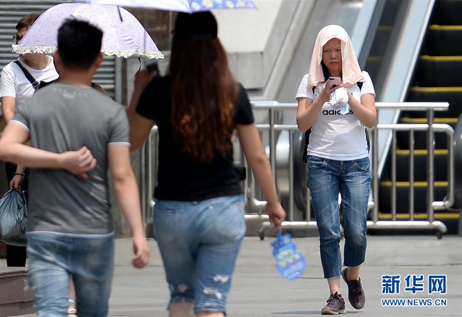7月3日,西安街頭一名市民用毛巾遮頭抵擋陽光照射。 陜西持續(xù)高溫天氣,西安、寶雞、安康等多地發(fā)布高溫預警。據(jù)最新預報顯示,今明兩天陜西大部分地區(qū)仍以晴到多云為主,關(guān)中南部和陜南東部部分地方還將出現(xiàn)35℃以上的高溫天氣,其中關(guān)中南部最高氣溫可達38℃至40℃,“燒烤”模式持續(xù)。新華社記者 劉瀟 攝