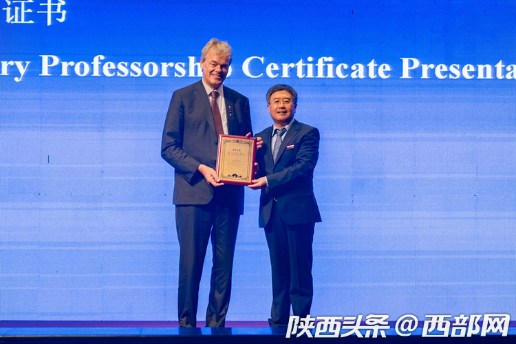 郭立宏向愛德華 莫澤頒發(fā)“西北大學(xué)榮譽(yù)教授”證書。(攝影:馬騫)
