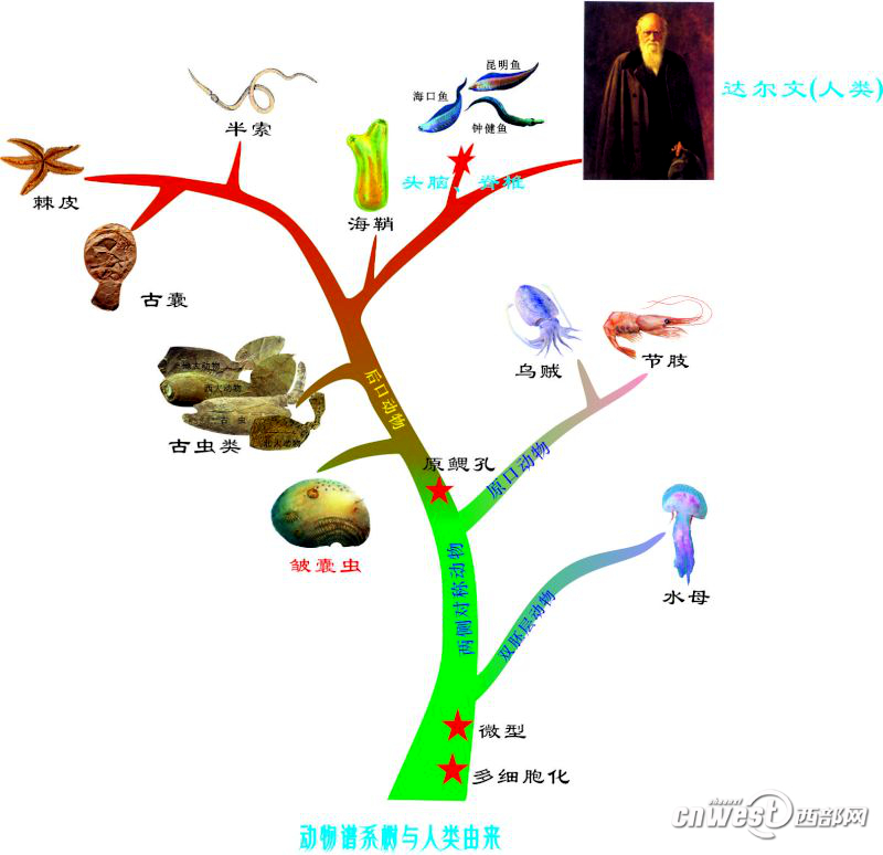 借助生物學(xué)和古生物學(xué)信息構(gòu)建動(dòng)物譜系樹并探尋其起源,是理清人類遠(yuǎn)古祖先演化脈絡(luò)的前提。由西北大學(xué)舒德干院士領(lǐng)軍的早期生命研究團(tuán)隊(duì)經(jīng)過多年來對(duì)云南澄江生物群的研究,在國際上首次揭示出脊椎動(dòng)物、頭索動(dòng)物、尾索動(dòng)物、棘皮動(dòng)物、古蟲動(dòng)物等后口動(dòng)物亞界幾乎所有門類的原始代表,為人類探索早期遠(yuǎn)祖的來龍去脈提供了基礎(chǔ)證據(jù)。