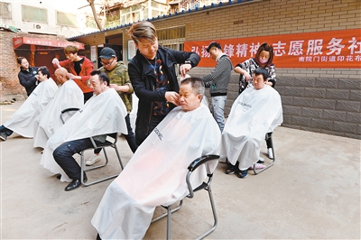 南院門街道印花布園社區(qū)工會(huì)聯(lián)合會(huì)開(kāi)展“弘揚(yáng)雷鋒精神 志愿服務(wù)社會(huì)”主題活動(dòng),邀請(qǐng)志愿者為轄區(qū)文明引導(dǎo)員、保潔員、居民群眾義務(wù)剪發(fā)。 記者 竇翊明攝