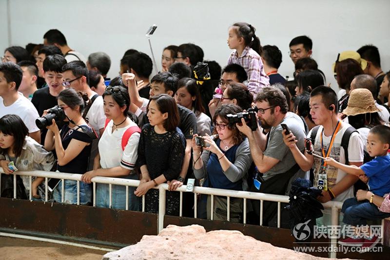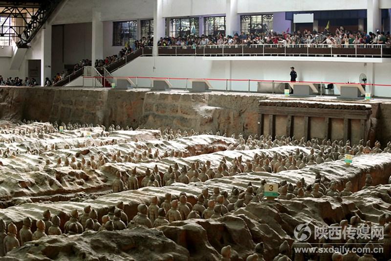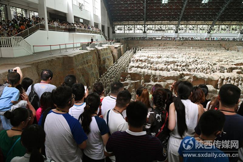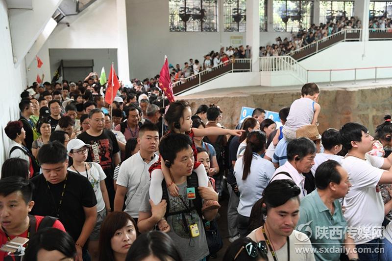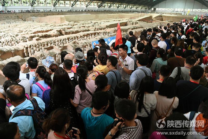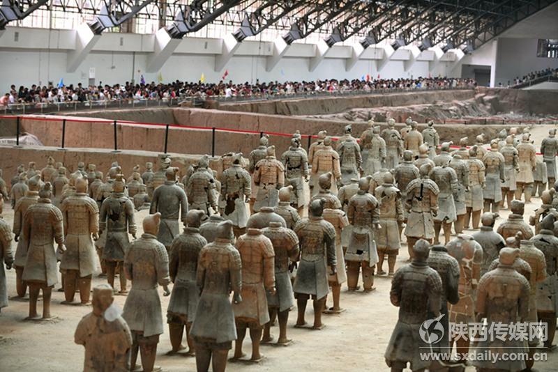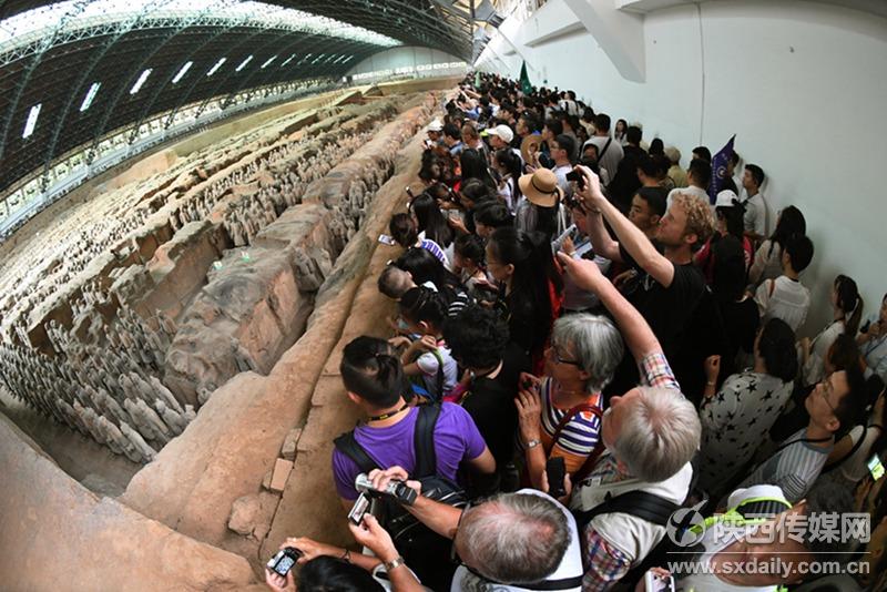 5月29日,中外游客在一號坑參觀游覽。當(dāng)日是端午節(jié)小長假第二天,截止17:30分,前來秦陵博物院參觀游覽中外游客達(dá)到38176人次,與去年同期相比增長9.73%。 陜西日報記者袁景智 通訊員 張?zhí)熘鶖z -