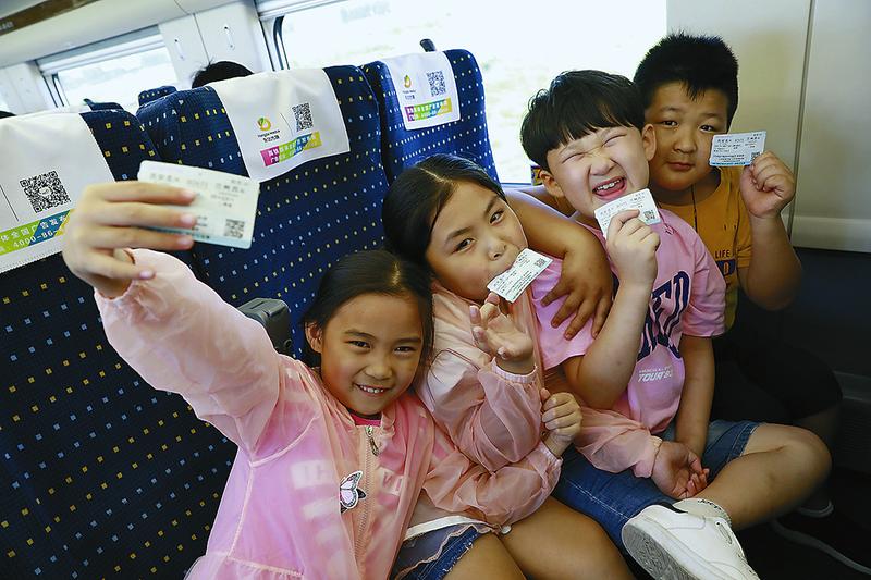 8月10日,在D2651次列車上,四名小朋友展示自己的車票。 本報記者 巨躍先 通訊員 王曙天攝