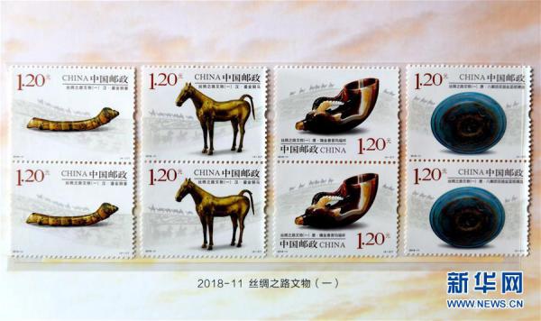 新華社西安5月19日電(記者梁愛平)中國(guó)郵政集團(tuán)公司19日在陜西西安首發(fā)《絲綢之路文物(一)》特種郵票1套4枚。郵票圖案名稱分別為:漢·鎏金銅蠶、漢·鎏金銅馬、唐·鑲金獸首瑪瑙杯、唐·八瓣團(tuán)花描金藍(lán)琉璃盤。