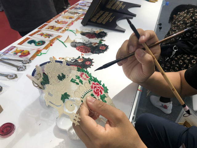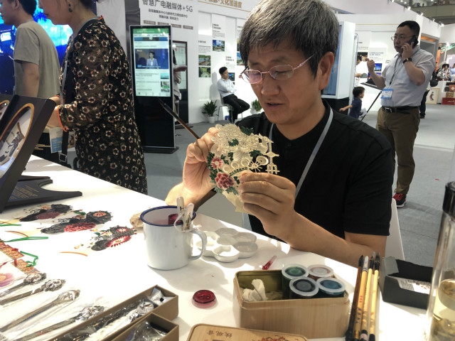 在文博會(huì)陜西展館的入口處,華州皮影制作技藝非遺傳承人薛宏權(quán)正在現(xiàn)場(chǎng)描畫皮影,嫻熟而獨(dú)特的操作,吸引了不少人駐足觀看。