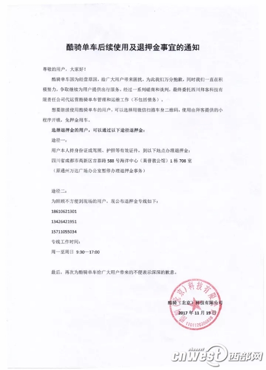酷騎單車發(fā)布公告,稱北京已經(jīng)停止退款,現(xiàn)場退押金只能去成都。
