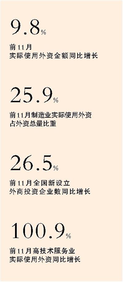 這些措施有力提振了外國投資者投資信心。今年前11月,行業(yè)吸引外資保持增長。制造業(yè)實際使用外資2077.6億元人民幣,同比增長0.2%,占外資總量比重的25.9%。服務(wù)業(yè)實際使用外資5827.5億元人民幣,同比增長13.5%,占外資總量比重的72.5%。中部地區(qū)吸收外資保持增長勢頭,實際使用外資520.9億元人民幣,同比增長29%。