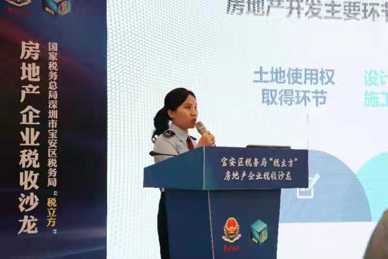 宣講會(huì)上,寶安區(qū)稅務(wù)局從土地使用權(quán)取得、設(shè)計(jì)建設(shè)施工、銷售、租賃使用四個(gè)環(huán)節(jié)展開稅收政策解讀,通過“政策+案例”的形式,全面介紹房地產(chǎn)業(yè)所涉及的稅收政策、容易出現(xiàn)的涉稅風(fēng)險(xiǎn),以及為企業(yè)提供稅務(wù)內(nèi)控管理的若干建議。