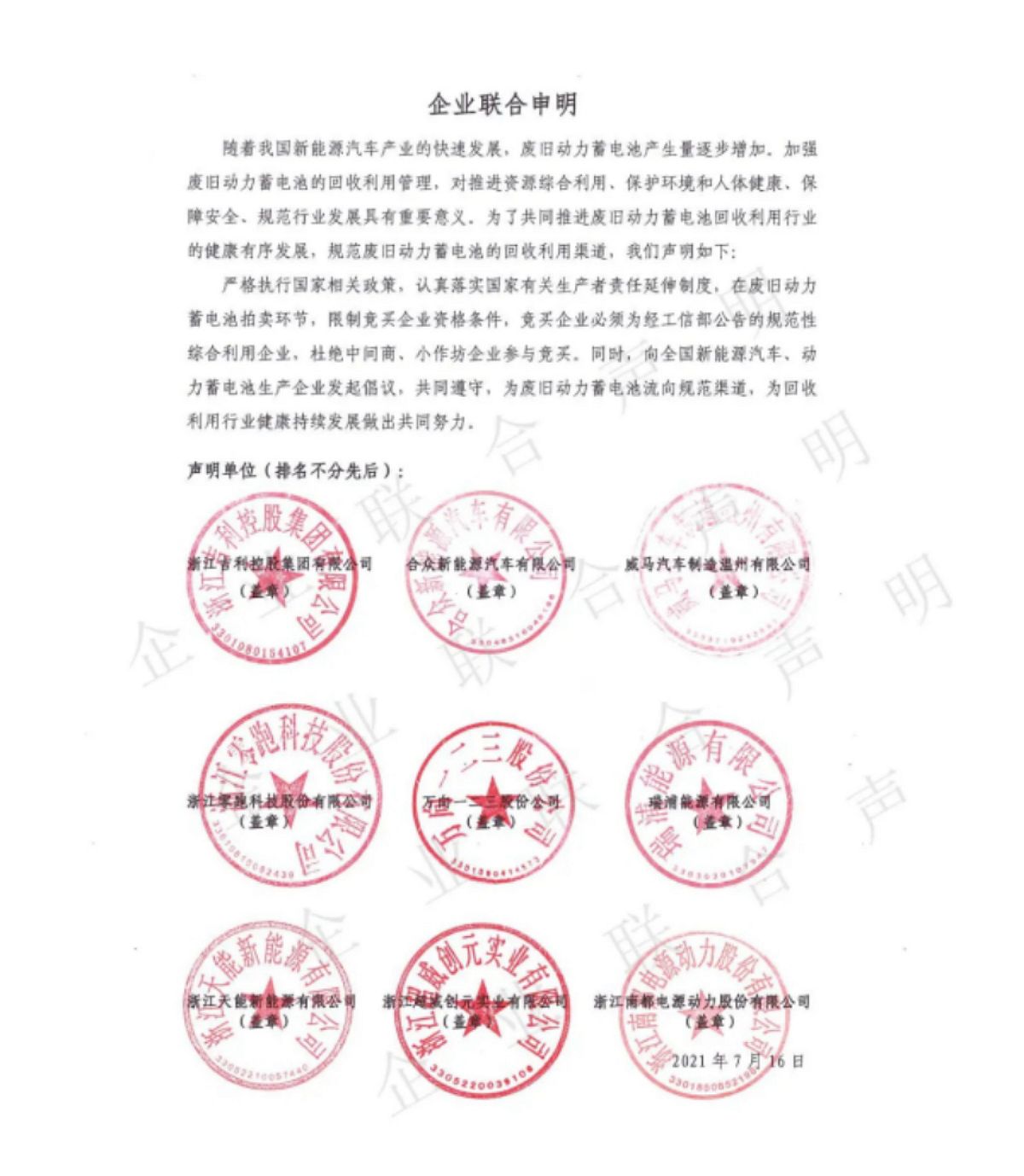 央廣網(wǎng)北京8月12日消息(記者 黃昂瑾)據(jù)杭州儲能行業(yè)協(xié)會微信公眾號消息,浙江省新能源汽車及動(dòng)力蓄電池生產(chǎn)企業(yè),積極落實(shí)國家有關(guān)生產(chǎn)者責(zé)任延伸制度,規(guī)范廢舊動(dòng)力蓄電池流向。2021年7月,杭州儲能行業(yè)協(xié)會組織吉利、合眾汽車、威馬汽車、零跑、萬向一二三、瑞浦能源、天能、超威、南都電源等9家新能源汽車及電池生產(chǎn)重點(diǎn)企業(yè)共同發(fā)起聲明,在交易拍賣廢舊動(dòng)力蓄電池環(huán)節(jié)增加限制性條件,競買企業(yè)須為經(jīng)工信部公告的規(guī)范性廢舊動(dòng)力電池綜合利用企業(yè),確保電池流向規(guī)范性企業(yè)。