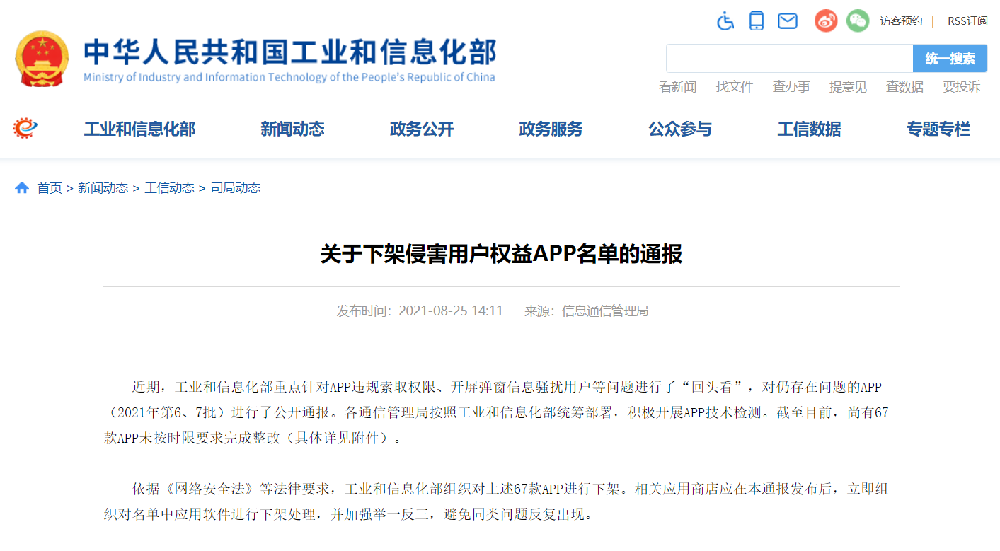 央廣網(wǎng)北京8月25日消息(記者 萬(wàn)玉航)據(jù)工信部網(wǎng)站披露,近期,工信部重點(diǎn)針對(duì)APP違規(guī)索取權(quán)限、開(kāi)屏彈窗信息騷擾用戶等問(wèn)題進(jìn)行了“回頭看”,對(duì)仍存在問(wèn)題的APP進(jìn)行了公開(kāi)通報(bào)。各通信管理局按照工信部統(tǒng)籌部署,積極開(kāi)展APP技術(shù)檢測(cè)。截至目前,尚有67款A(yù)PP未按時(shí)限要求完成整改。