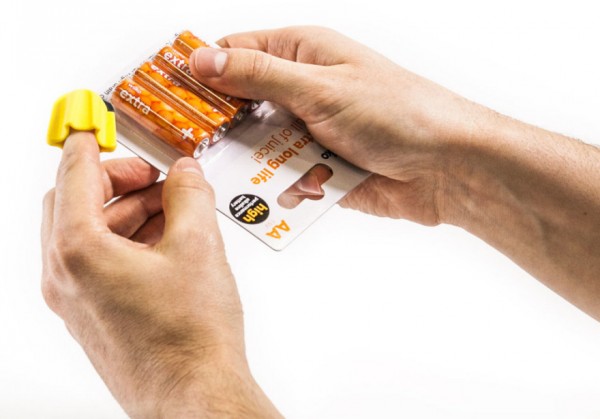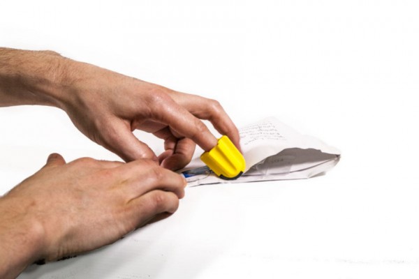 問世這款產(chǎn)品體積十分小巧,僅比成年人手指頭略大,將它戴在手指上即可使用。拆包裝利器的玄機(jī)在于,其頂端黑色的部分為陶瓷刀片,可以很快的將各種塑料封條和包裝袋拆開。