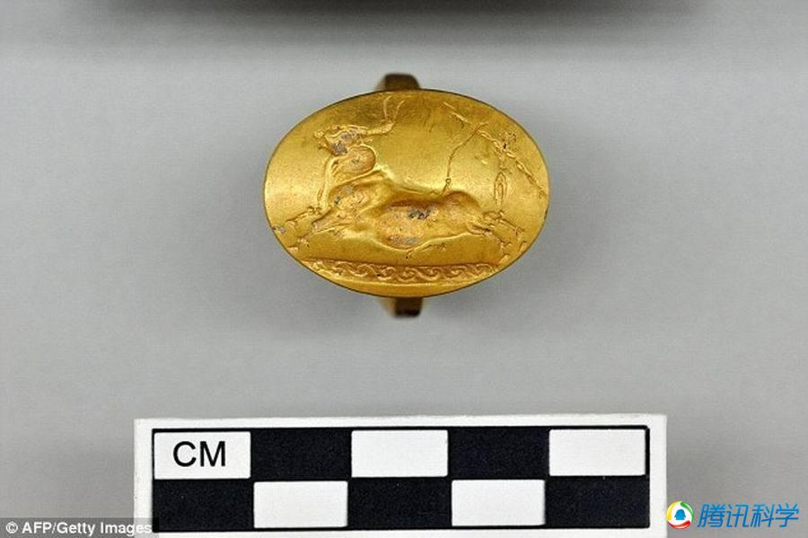目前,考古學(xué)家在希臘境內(nèi)挖掘發(fā)現(xiàn)一具3500年前古代戰(zhàn)士墳?zāi)梗l(fā)現(xiàn)的大量珍寶有助于揭曉古希臘文明的起源?脊艑W(xué)家共挖掘發(fā)現(xiàn)4枚戒指,圖中是一枚金戒指,圖案顯示一只跳躍的公牛,這是古希臘克里特文明中一種最普通的圖案主題。(騰訊科學(xué)訊悠悠/編譯)