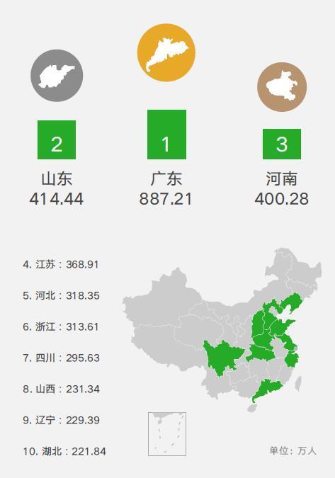 出行人數(shù)最多的省份依次為:廣東,山東,河南,江蘇,河北,浙江,四川,山西,遼寧,湖北。