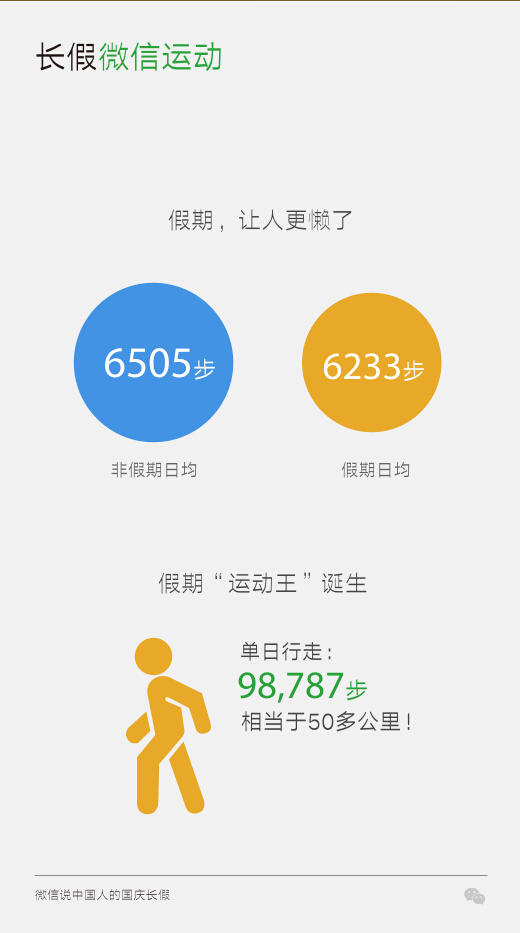國(guó)慶長(zhǎng)假對(duì)于很多人也是個(gè)刷微信運(yùn)動(dòng)的好時(shí)候。不過(guò)和非假期相比,假期的平均步數(shù)實(shí)際上減少了約200步。但是,有用戶在一天之內(nèi)走的步數(shù)達(dá)9.8萬(wàn)步,如果按每小時(shí)走6000步算,相當(dāng)于該用戶馬不停蹄走了16個(gè)小時(shí)。