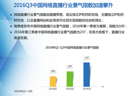 網絡直播行業(yè)景氣指數由直播帶寬、觀眾獨立IP和獨立在線、主播獨立IP和同時在線,以及直播網站和應用貨幣化四方面指數綜合加權得出。景氣指數每季度發(fā)布,2016年第一季度為基期,指數為100。