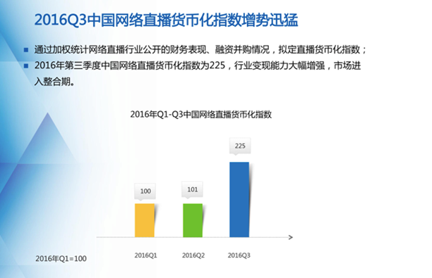 值得注意的是,在今年第三季度,我國網絡直播行業(yè)的變現能力出現大幅增強!吨袊W絡直播行業(yè)景氣指數報告》顯示,2016年第三季度中國網絡直播貨幣化指數為225,環(huán)比增長122.8%。中國信通院研究院政策經濟研究所主任何偉表示,“當前,我國互聯網直播的內容和形式呈現出多元化探索的特征,網絡直播與各行業(yè)業(yè)態(tài)之間的融合加深,直播+爆發(fā)出強大的生命力,這種融合不僅是我國產業(yè)融合創(chuàng)新的重要體現,也是直播平臺未來拓寬變現模式的主要方向!