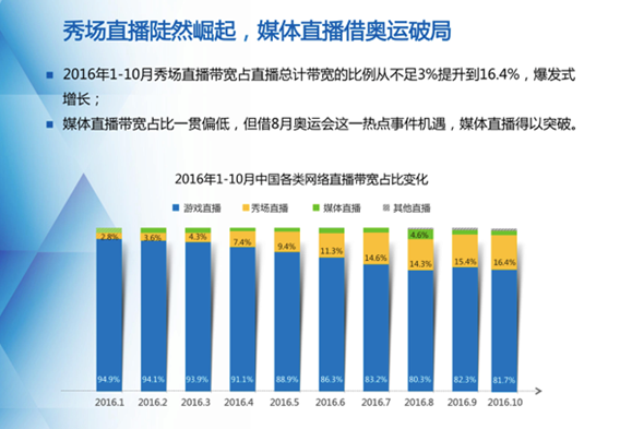 從不同類型直播的帶寬占比來看,2016年1-10月秀場直播帶寬占直播總計帶寬的比例從不足3%提升至16.4%,實現爆發(fā)式增長,相比1月,10月秀場直播帶寬指數已增長超9倍;媒體直播帶寬占比一貫偏低,但借8月奧運會這一熱點事件機遇,媒體直播得以突破;游戲直播帶寬總量穩(wěn)定增長,借暑假和十一假期保持加速增長勢頭。