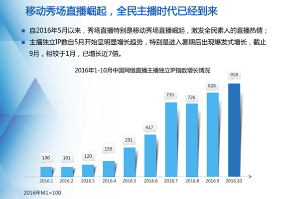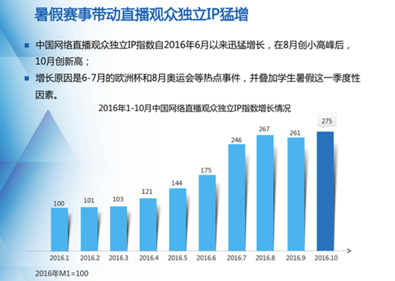 從中國網絡直播觀眾方面來看,觀眾獨立IP指數自2016年6月以來迅猛增長,在8月創(chuàng)小高峰后,10月創(chuàng)新高,增長原因在于6-7月的歐洲杯以及8月奧運會等熱點事件,并疊加了學生暑假這一季度性因素。