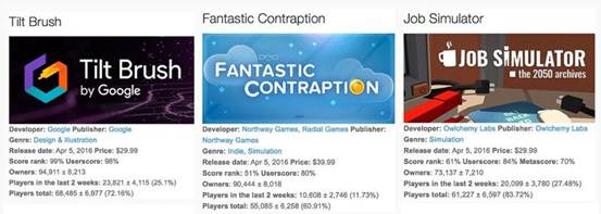 SteamSpy是steam的數(shù)據(jù)庫(kù)網(wǎng)站,就如同它的名字一般,真的是像個(gè)間諜一樣可以在上面查到所有你想要的關(guān)于steam的數(shù)據(jù),如購(gòu)買(mǎi)人數(shù)、實(shí)時(shí)在線人數(shù)、玩的時(shí)長(zhǎng)等。HTC vive于2016年4月發(fā)貨,在4月-7月這段早期發(fā)售時(shí)間里vive以捆綁銷(xiāo)售的方式捆綁了3款游戲《Tilt Brush[iii]》、《FantasticContraption[iv]》和《Job Simulator[v]》在vive里,那么通過(guò)看這段時(shí)間里這3款游戲的持有人數(shù)量就能大致的推斷截止7月底HTC vive的銷(xiāo)量。如下圖:
