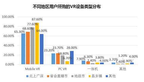 數(shù)據(jù)近8成個(gè)人用戶以購(gòu)買(mǎi)Mobile VR為主,價(jià)格區(qū)間在200元左右,大部分為近半年所購(gòu)。中高端VR設(shè)備大多數(shù)應(yīng)用于商用市場(chǎng),主要以線下體驗(yàn)店為主[x]。