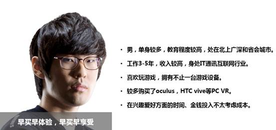 這類(lèi)用戶的精力旺盛,追逐刺激體驗(yàn),大都在購(gòu)買(mǎi)前有在各種渠道(借別人的、體驗(yàn)店等)體驗(yàn)過(guò),對(duì)VR帶來(lái)的全景體驗(yàn)覺(jué)得新奇,對(duì)VR游戲特別期待。猴急猴急的想自己擁有一臺(tái)VR,覺(jué)得酷斃了。這里想想自己當(dāng)年想買(mǎi)游戲機(jī)時(shí)候急切的心情就是了。