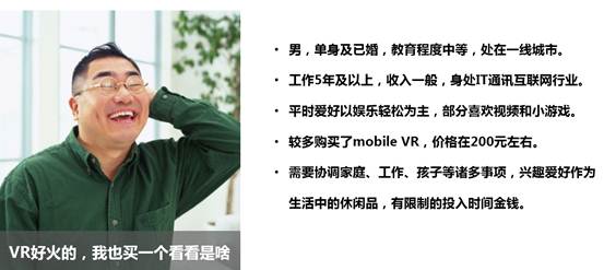 在研究中提煉到的第二類(lèi)典型用戶也很有意思,他們是VR的跟風(fēng)購(gòu)買(mǎi)者,同時(shí),他們也是性價(jià)比追求者。他們清楚VR目前在這個(gè)階段尚不成熟,但同時(shí)又想跟風(fēng)體驗(yàn),所以他們不會(huì)花很大的價(jià)錢(qián)去追逐購(gòu)買(mǎi)。他們也明白自己是跟風(fēng)體驗(yàn),所以只會(huì)為這種跟風(fēng)體驗(yàn)支付相應(yīng)的低成本費(fèi)用,主要購(gòu)買(mǎi)Mobile VR,價(jià)格在200元左右。也并不是他們付不起,只是覺(jué)得不值當(dāng)。