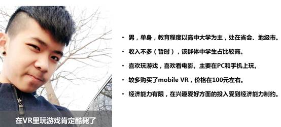在定量研究中發(fā)現(xiàn)了一批我們?cè)瓉?lái)沒(méi)有想到的用戶,他們以學(xué)生群體居多。正是精力旺盛的年齡里他們熱愛(ài)一切新鮮事物,愛(ài)玩游戲,越刺激越好。奈何迫于收入的限制購(gòu)買(mǎi)的以Mobile VR為主,價(jià)格在100元左右。他們也知道幾千塊的體驗(yàn)更好,但是當(dāng)下只能買(mǎi)個(gè)便宜的過(guò)過(guò)癮。