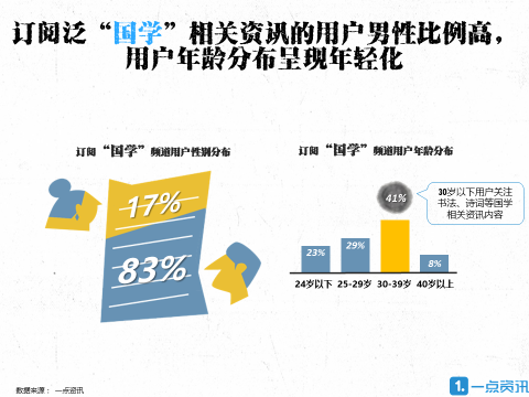 會上,一點(diǎn)資訊副總裁金治受邀致辭并發(fā)布了一點(diǎn)資訊《2016年度國學(xué)網(wǎng)民閱讀指數(shù)報告》。報告顯示,國學(xué)相關(guān)訂閱頻道熱度方面,四大名著和被古人奉為文人四友的“琴、棋、書、畫”等傳統(tǒng)文學(xué)、文化內(nèi)容依然備受青睞;群體層面上,男性關(guān)注比例遠(yuǎn)超女性,用戶整體分布趨于年輕化;而按照地域劃分,在歷史悠久、文化底蘊(yùn)厚重的城市中生活的用戶對國學(xué)內(nèi)容更加關(guān)注;整體趨勢方面,泛國學(xué)相關(guān)頻道關(guān)注熱度持續(xù)上升。