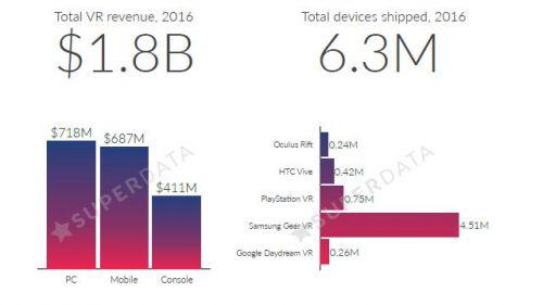 2月6日消息,市場研究分析機構SuperData近期聯(lián)合開發(fā)平臺Unity發(fā)布了一份關于2016年虛擬現(xiàn)實市場的報告。報告中指出,虛擬現(xiàn)實市場在2016年總產值高達18億美元,而VR頭顯設備的總銷量達到630萬臺。其中,各個VR廠商表現(xiàn)各有不同。