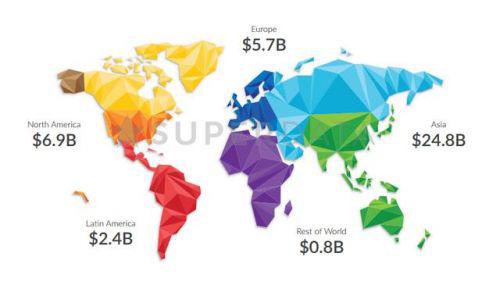 報告指出,2016年VR市場PC端總產值為7.18億美元,移動端6.87億美元,主機端為4.11億美元。在營收中,游戲表現(xiàn)搶眼,占據(jù)了44%的市場份額。除此之外,數(shù)據(jù)顯示,全球移動游戲收入為406億美元,手游市場規(guī)模已與全球電影票房收入持平,而且仍在高速增長。亞洲市場在整個手游市場中占據(jù)領導地位,份額達248億美元,北美以69億美元位居其次,歐洲以57美元位居第三。(TechWeb)