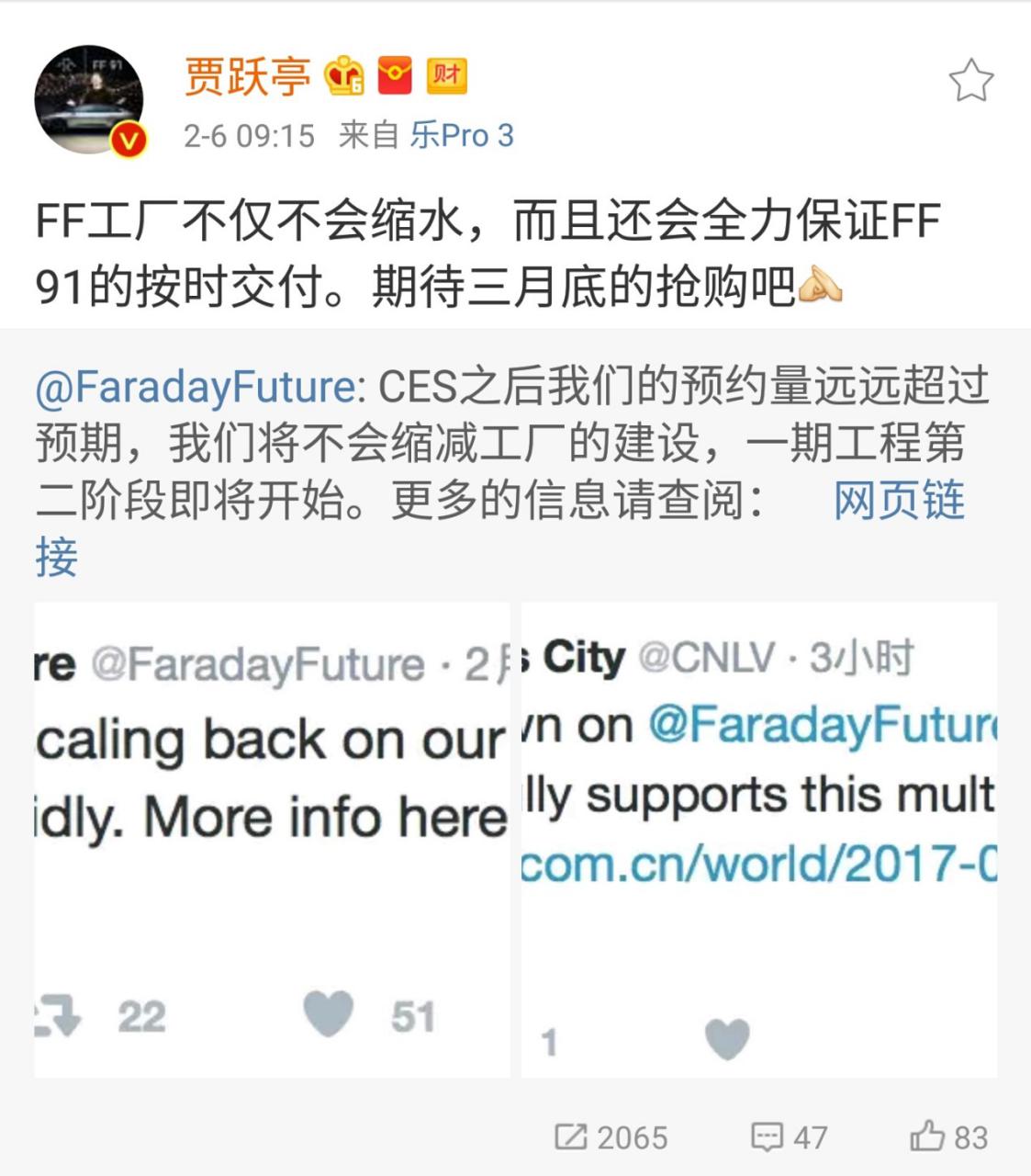 春節(jié)假期剛過,又有媒體開始傳言樂視戰(zhàn)略伙伴Faraday Future工廠縮水和FF 91訂單數(shù)量的問題,對此,樂視董事長兼創(chuàng)始人賈躍亭在其微博上做出了回應(yīng):“FF工廠不僅不會縮水,而且還會全力保證FF 91的按時(shí)交付。期待三月底的搶購吧!