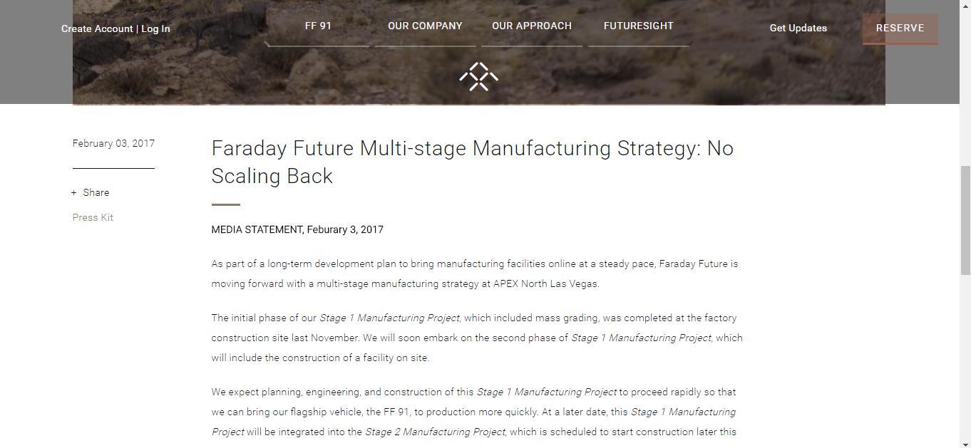 FF已于去年11月完成了一期工程第一階段的地面平整建設(shè)。對于下一步的工廠建設(shè)工作,F(xiàn)F也在這個(gè)聲明中做出了解釋。