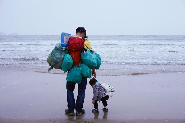 (圖:一位大人帶著孩子撿拾沙灘垃圾)